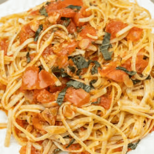 Sautéed onions with bacon and fresh sliced tomato fillets. Served with your choice of penne rigate or fusilli pasta